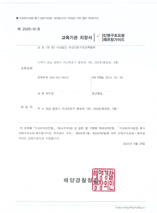인명구조요원 지정서 페이지 정보 작성자 관리자 댓글 0건 조회 842회 작성일 19-04-15 09:24 본문 인명구조요원 지정서 목록 이전글사업자등록증 19.04.15 다음글수상구조사 교육기관 지정서 19.04.15
