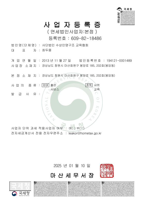 사업자등록증 페이지 정보 작성자 관리자 댓글 0건 조회 1,462회 작성일 19-04-15 09:24 본문 사업자등록증 목록 이전글민간자격등록증-생존수영강사 19.12.20 다음글인명구조요원 지정서 19.04.15