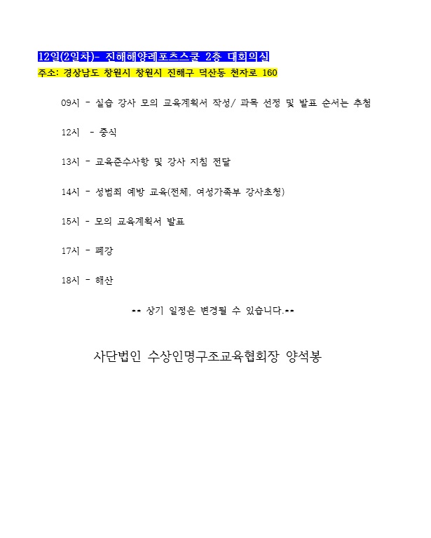 공지 2020 (사)수상인명구조교육협회 교육 세미나 개최 페이지 정보 작성자 관리자 댓글 0건 조회 4,057회 작성일 19-12-19 15:05 본문 여러분의 많은 참여 바랍니다. 목록 이전글사단법인 수상인명구조교육협회 임시이사회 개최 안내 19.12.20 다음글수험생 이벤트 19.10.29