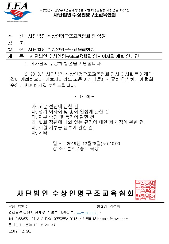 공지 사단법인 수상인명구조교육협회 임시이사회 개최 안내 페이지 정보 작성자 관리자 댓글 0건 조회 3,733회 작성일 19-12-20 10:02 본문 임원들의 많은 참석바랍니다. 목록 이전글홈페이지 개편 및 점검으로 일부사용제한이 있으니 참고하시길 바랍니다. 20.01.03 다음글2020 (사)수상인명구조교육협회 교육 세미나 개최 19.12.19