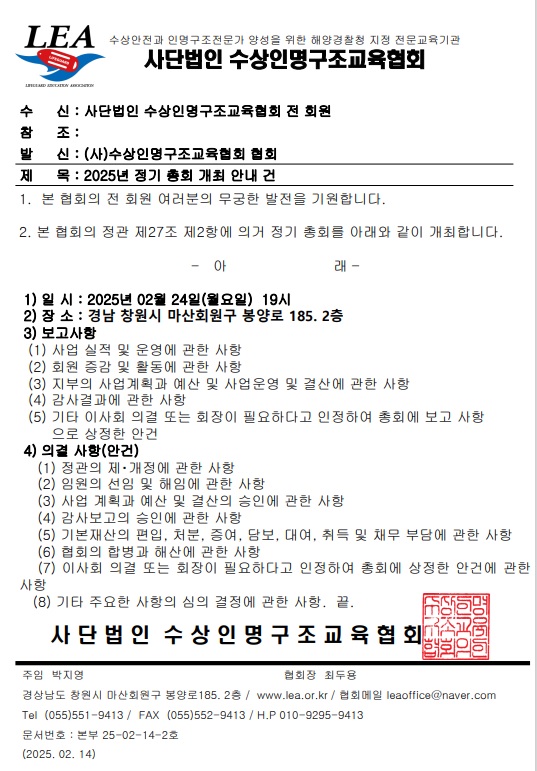 공지 25년 정기 총회 개최 안내 페이지 정보 작성자 사무국1 댓글 0건 조회 2,024회 작성일 25-02-14 14:41 본문 협회의 모든 회원은 바쁜 일정이시더라도 많은 참석과 관심을 가져주시면 감사하겠습니다. 목록 이전글26년 정기 총회 개최 안내 26.01.26 다음글창원시 『해양레포츠 자격증 취득 교육비 지원』사업 공고 25.02.03