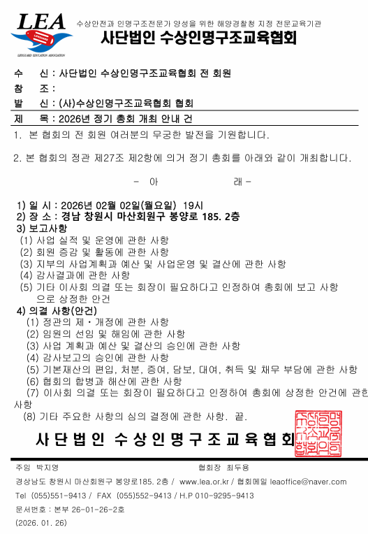 공지 26년 정기 총회 개최 안내 페이지 정보 작성자 총무부 댓글 0건 조회 392회 작성일 26-01-26 11:19 본문 협회의 모든 회원은 바쁜 일정이시더라도 많은 참석과 관심을 가져주시면 감사하겠습니다. 목록 이전글2026년 교육비인상 안내 26.01.27 다음글25년 정기 총회 개최 안내 25.02.14