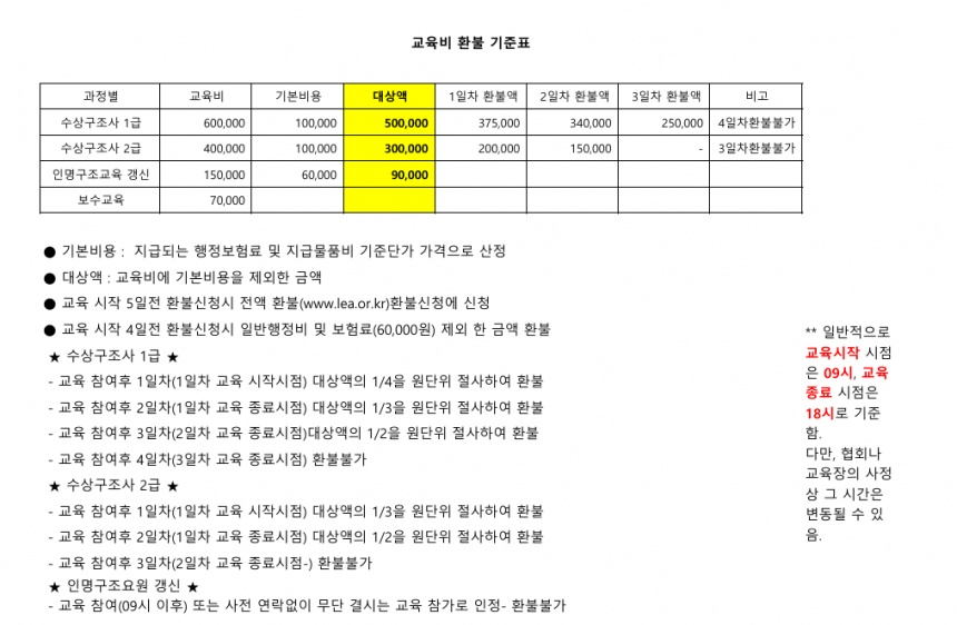 공지 2026년 교육비 환불기준표 페이지 정보 작성자 총무부 댓글 0건 조회 457회 작성일 26-01-27 16:55 본문 2026년 교육비 환불기준표 목록 이전글2026년『해양레포츠 자격증 취득 교육비 지원사업』 공고 26.02.20 다음글2026년 교육비인상 안내 26.01.27