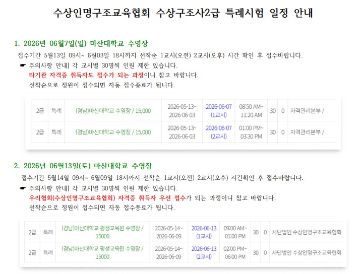 공지 6월 수상구조사2급 특례시험 일정 안내