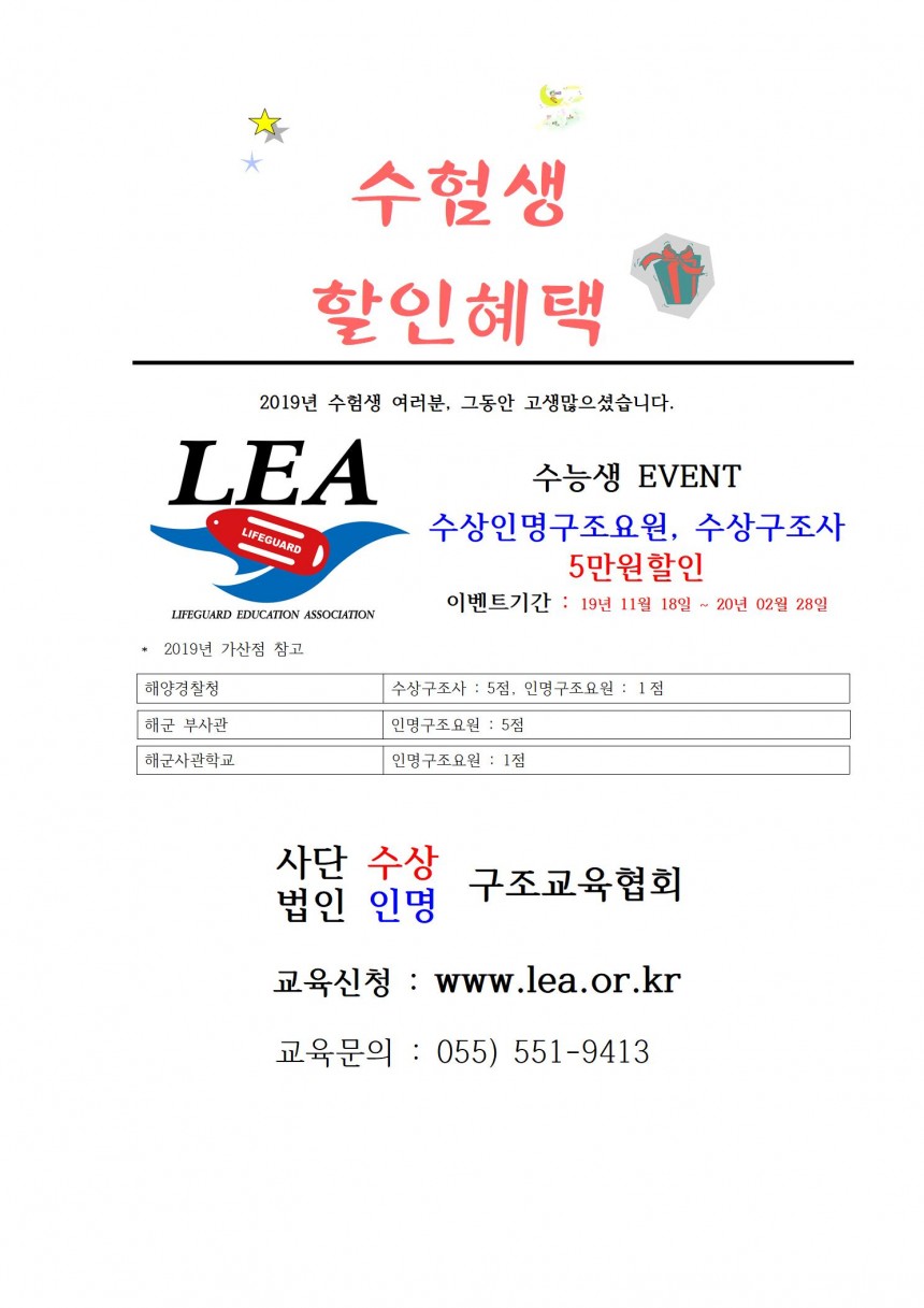 공지 수험생 이벤트 페이지 정보 작성자 관리자 댓글 0건 조회 4,627회 작성일 19-10-29 10:34 본문 2019년 수험생 할인혜택 목록 이전글2020 (사)수상인명구조교육협회 교육 세미나 개최 19.12.19 다음글해군사관학교 가산점안내 19.10.23