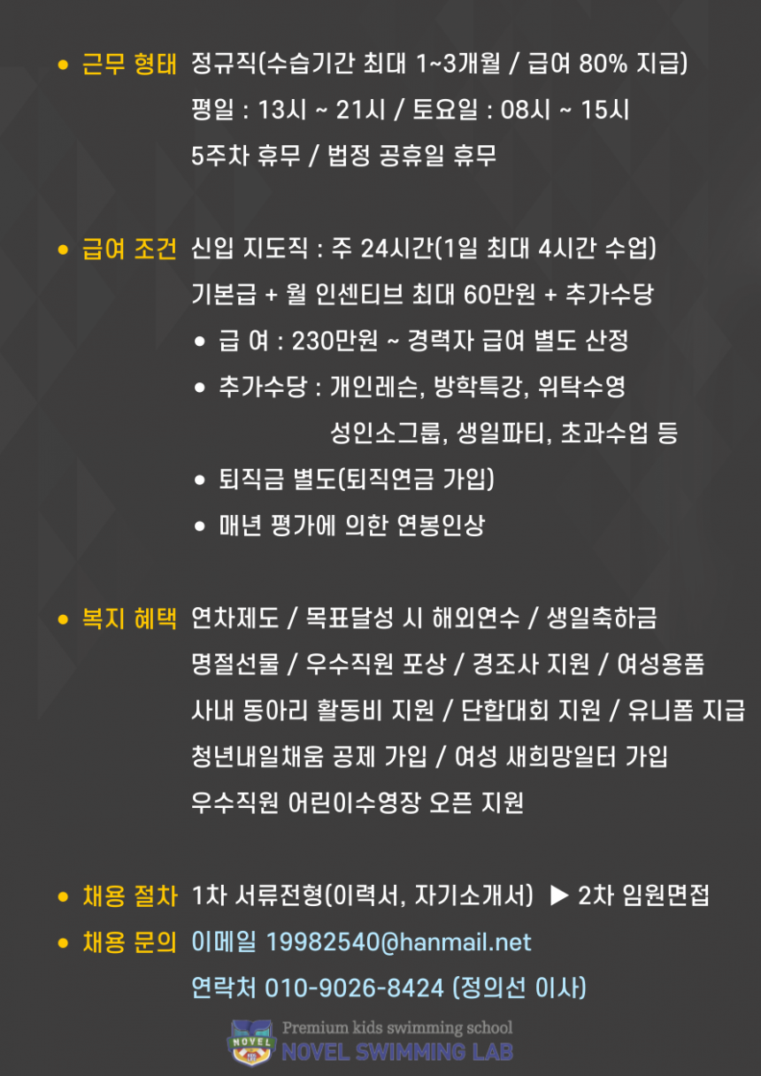 공지 노블스위밍랩 2024상반기 정규직 채용공고 페이지 정보 작성자 총무부 댓글 0건 조회 2,709회 작성일 24-01-12 17:29 본문 노블스위밍랩 2024상반기 정규직 채용공고 목록 답변 글쓰기 이전글창원) 점프점프 키즈스포츠 유아체육 선생님을 모십니다. 24.01.24 다음글창녕군시설관리공단 직원 공개채용 공고안 23.11.21 댓글목록 댓글목록 등록된 댓글이 없습니다.