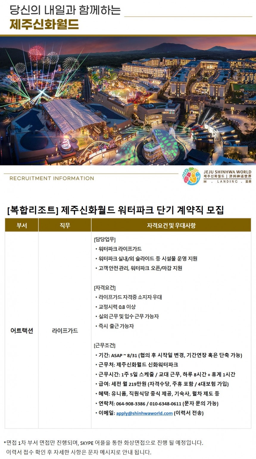 문의사항 제주신화월드 인사 채용팀 김혜인 064 908 3386