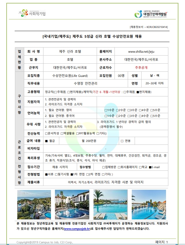 2. 제주도 5성급 신라 호텔 라이프가드 채용