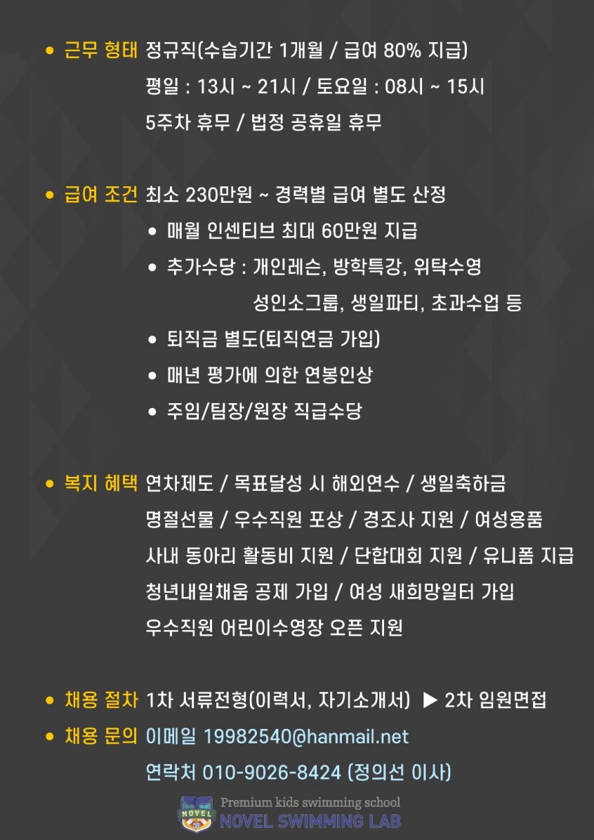 공지 NOVEL SWIMMING LAB 정규직 채용 페이지 정보 작성자 총무부 댓글 0건 조회 2,537회 작성일 24-07-11 17:06 본문 NOVEL SWIMMING LAB 정규직 채용 목록 답변 글쓰기 이전글파주도시관광공사 채용공고 24.11.04 다음글여주도시공사 기간제 수영강습원 모집 공고 24.07.02 댓글목록 댓글목록 등록된 댓글이 없습니다.