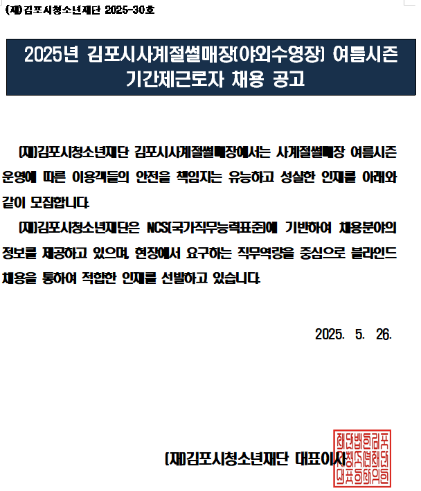 공지 김포시사계절썰매장(야외수영장) 여름시즌 기간제근로자 채용 공고